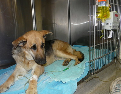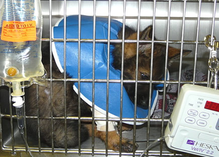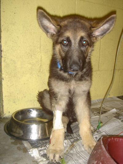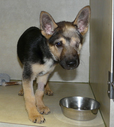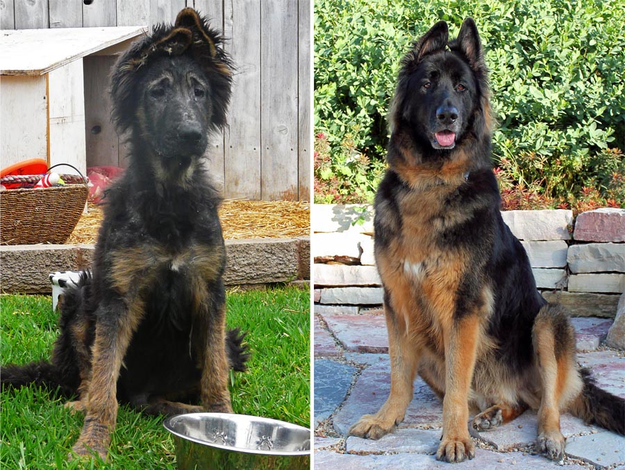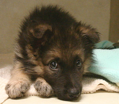 Nugget came to us very sick at the age of 8 weeks. He was diagnosed with DISTEMPER. Distemper is a deadly disease for dogs and very few survive it. After months under Robin's 'intensive' care, Nugget was finally able to go to his new home with a clean bill of health. We are thrilled, amazed and just so happy to see this stunning shepherd today. On the left, you see Nugget at the vet's hospital. We were sure he was a mix. Just look at him now, he's the most stunning sable German Shepherd with a wonderful temperament. His new mom just adores this handsome boy! |