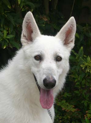 Adopted Lobo is a stunning, pure white German Shepherd. His coat is so white that it is dazzling. He is 2 years old and is a good- sized boy. |
