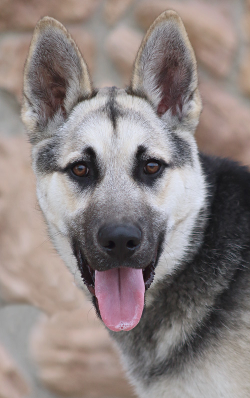 Blue von Bitzen is a delightful 6-month-old German Shepherd. Blessed with striking silver-and-black coloration, this boy stands out from the pack. The beautiful markings on his sweet, smiling face make him even more special -- but he is much more than just a pretty face! He's a very sociable and outgoing pup who enjoys meeting just about every dog or person who comes along. Blue comes out of the kennel happy and ready for any adventure. He is affectionate with people and playful with dogs, and enjoys running around the yard in playgroup, inviting others to have some fun! In typical puppy fashion, this easygoing guy enjoys being a silly goofball. He also likes to follow his humans around and stay close. He is not, however, a fan of kitties. Blue is ready to settle down in California or is happy to move out of state. |