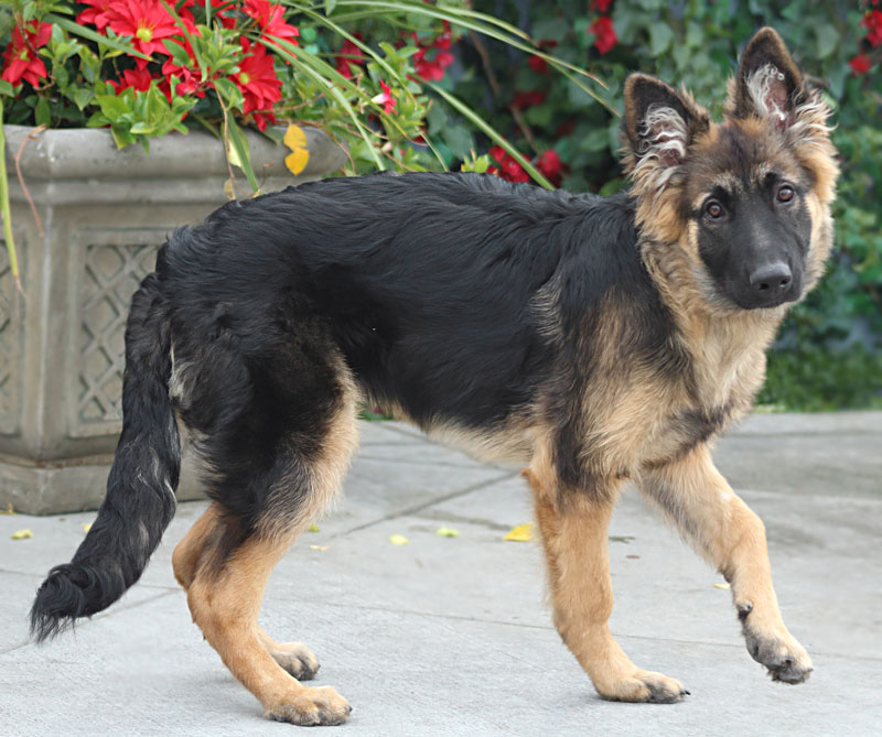 Romy von Sorvino is a beautiful 6 month old coated German Shepherd with the softest coat and cutest ear fluffs. Her name means “dew of the sea” and she lives up to her name with her love of chasing the water out of the hose when her foster mommy is watering the plants. She loves other dogs and meets everyone with tail wags and kisses. She is a VERY active girl who needs a large playful dog in her forever home and doggy parents who know how to focus her never ending energy in a positive way. Romy is very smart and quickly learned that outside is where she needs to potty and will paw at the door when she needs to go out. She learned that the crate is her place to sleep at night and when her foster mommy has to leave the house for errands and she lays there quietly until it’s time to come out and play! This energizer bunny needs a very active home with German Shepherd experience. Unfortunately, she is too gregarious for young children, small dogs and cats. |