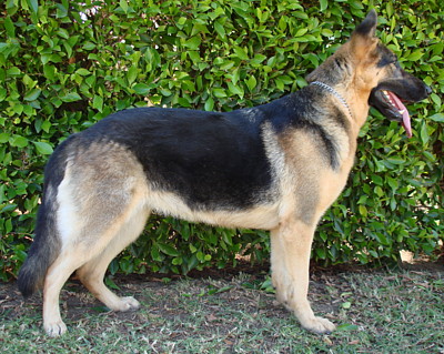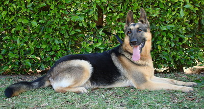 Sasha von Stone is a beautiful, classic black and tan German Shepherd. She's very people friendly and loves to be petted. She has nice house manners and is housebroken. She knows her basic commands- sit, down, stay, come. Squeeky toys and tennis balls are her favorite toys, but cats are too much of a temptation so a kitty free home is a must. She has very good food manners and she really enjoys being brushed. Her owners loved her very much but were unable to keep her any longer and have asked us to find her a loving forever home and we promised her we would. |