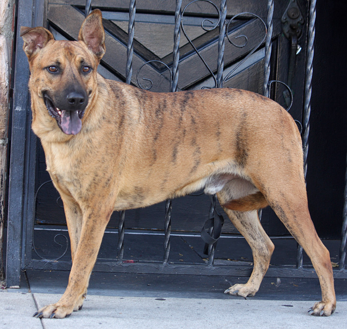 Tiger von Tigger is a striking looking 18 month old Shepherd/Tiger mix! (Just look at those stripes!) Tiger is house-trained, leash-trained, crate-trained, and does well in the yard. Despite his fierce good looks, his affection and easygoing demeanor are evident for everyone to see. Tiger does especially well with the ladies, but is tolerant of other male dogs on walks. In playgroups, he avoids any hint of trouble, and enjoys sticking close to his people. Tiger is simply a beautiful, calm dog who is longing to be someone’s best friend. Not only does is he prepared to follow basic commands, but he loves to cuddle! Let’s see, movie star handsome, obedient, a cuddler, a mellow fellow…we tried to find something wrong with Tiger, but failed miserably. Please tell us you are ready to take on this much fantastic. |